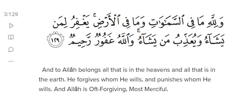 “Allah owns whatever in the skies and the earth. He forgives whoever He wants, he punishes whoever He wants. And Allah is extremely forgiving loving and merciful.”